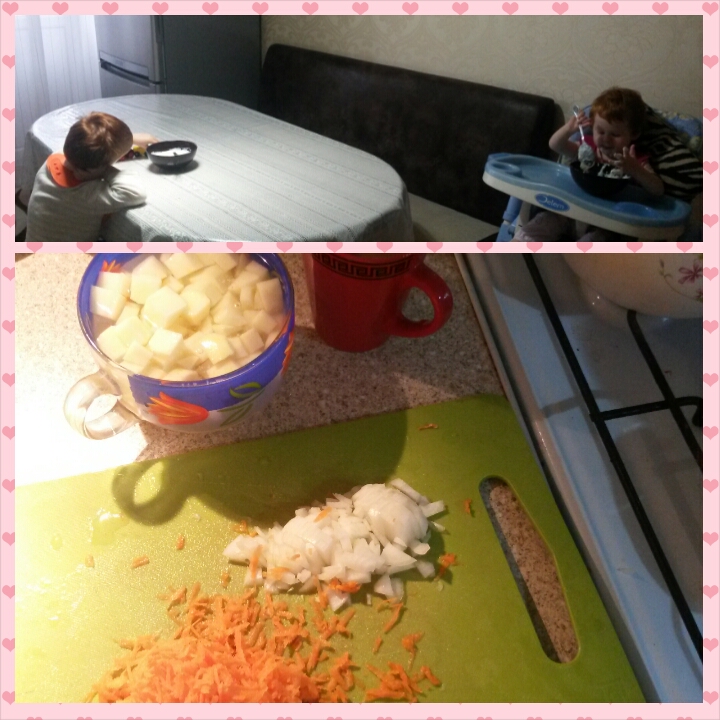 9:21 Дети завтракают кашей, я продолжаю готовить суп. В процессе пью уже холодный кофе и доедаю за детьми кашу.