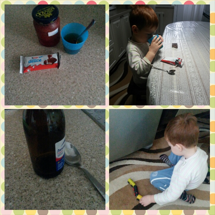 До основного завтрака еще далеко, поэтому небольшой перекус. После даю ребенку сироп от кашля, потом ребенок играет с любимыми паровозиками.