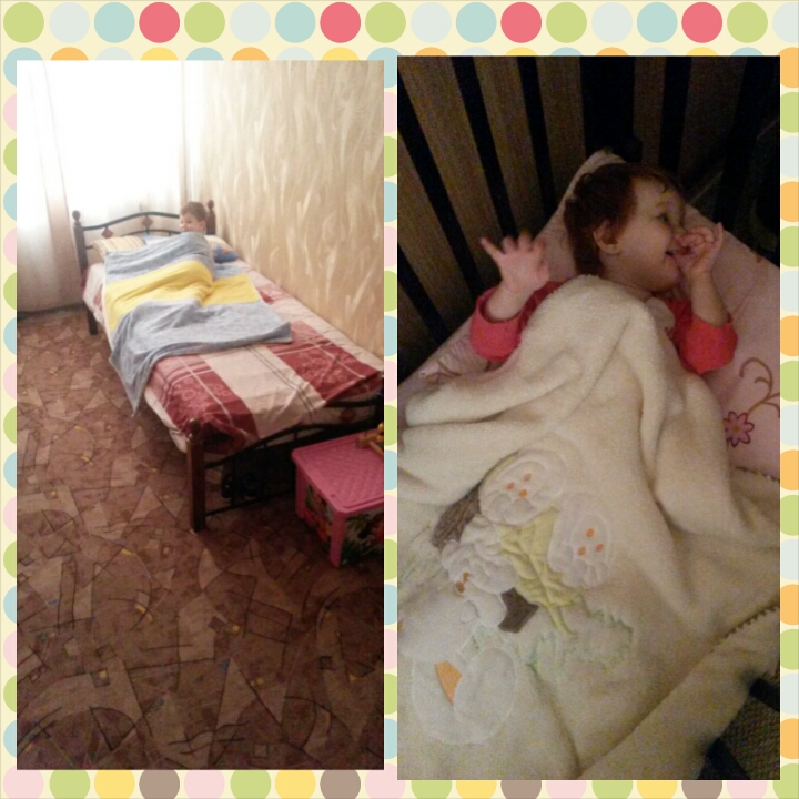 12:58 Иду укладывать детей спать. Виолетта у себя в кроватке, а Демид в другой комнате на большой кровати. Вместе уже на дневной сон не кладу детей, тк толком заснуть не могут, постоянно отвлекаются друг на друга: хихикают, Демид в кровать к сестре лезет. А ночью спят в одной комнате.