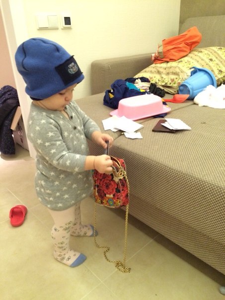 Пока мама на кухне, Ви уже куда-то собралась и роется в маминой сумочке)