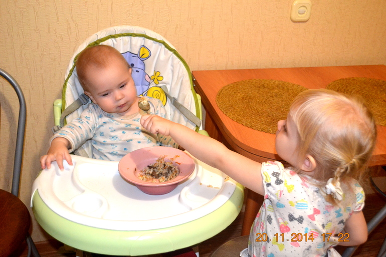 Кирилл грозно хмурит брови,как бы намекает-"мама-моя!"..Затем ,уже прямым текстом начинает вещать"аммеаннаа!" и пихать Алёнку.