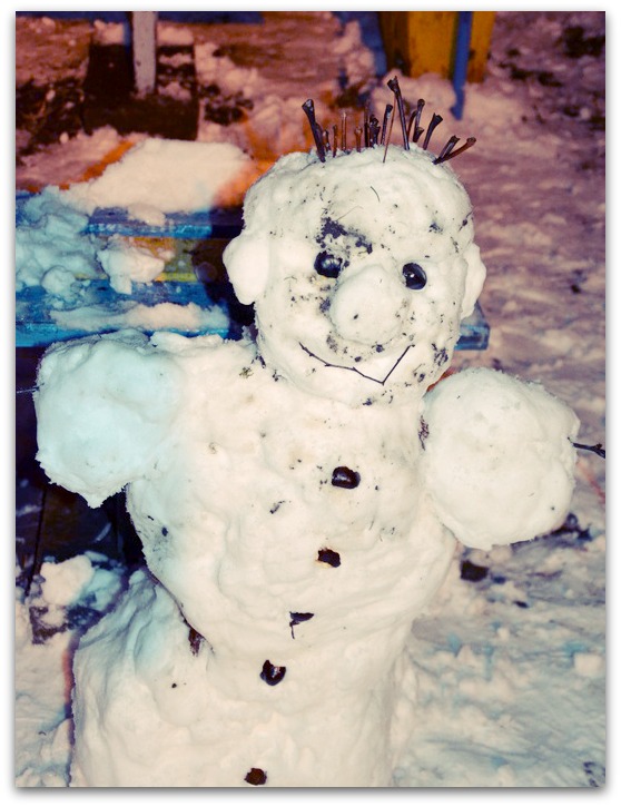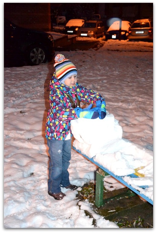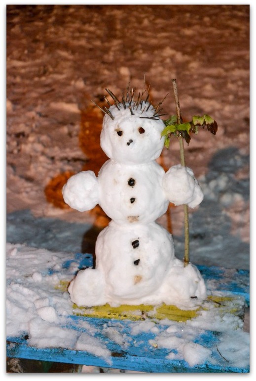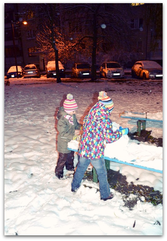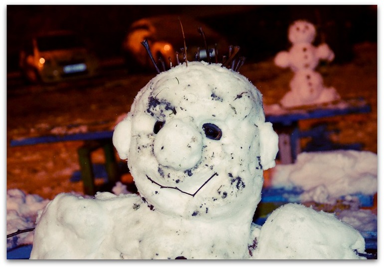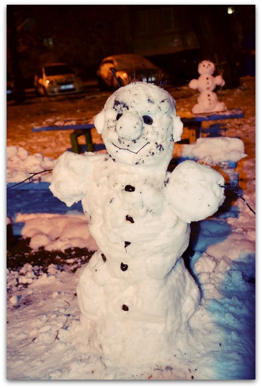 А вечером того же дня мы успели еще в потемках слепить Снеговика. Волосатый, нос картошкой, добродушный - настоящий белорус. По соседству в свете фонарей лепили своего Снеговичка соседи. Домой пошли только после того, как у мамы замерзли ноги, а у Симы потерялась лопата.