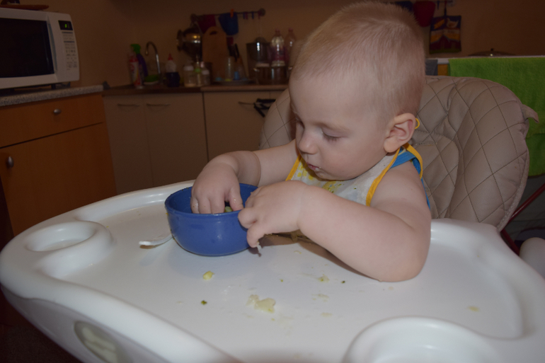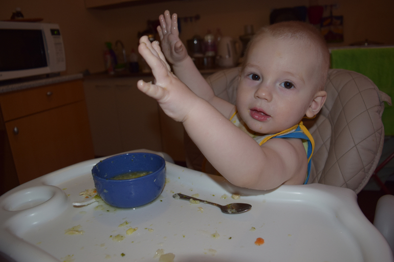 Саву приходится уговаривать сесть за стол, так заигрался в лего, на обед у детей овощной суп с курочкой, немного ем сама, чтобы дети начали есть за мной сами, но Сава постоянно отвлекается, пришел ко мне на стул есть из моей тарелки, кормлю его![]()