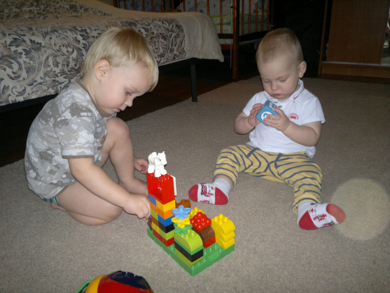 Я их вместе играть объединяла, когда Илье месяца 2-2,5 было, сначала погремушки вместе потрясти, на коврике полежать вместе и игрухи подергать, на качелях младшего покачать и т.п., а потом позже когда стал ползать вообще веселье общее началось))))