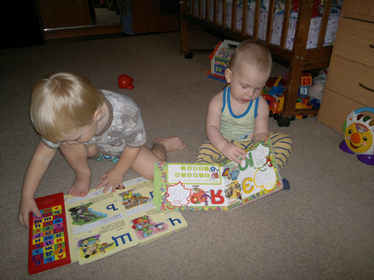 Сава приносит мне книжки. начинаем повторять с ним алфавит. к нам присоединяется Илья, сначала как обычно не могут поделить книжки, каждому нужна одна книга)))) разруливаю начинающийся конфликт. уговариваю взять разные и усаживаю "читать"![]()