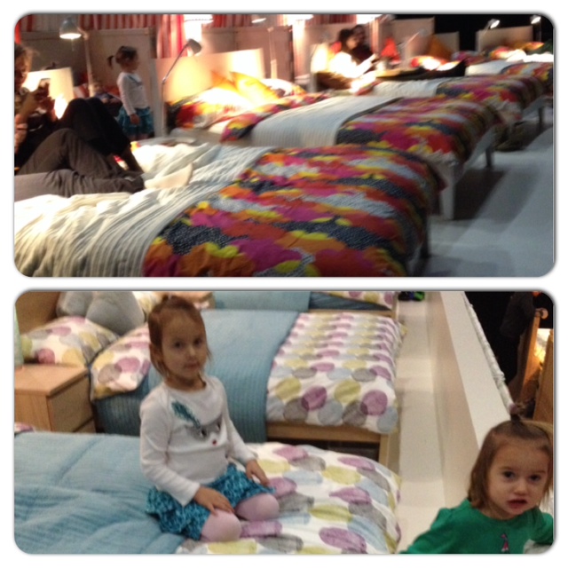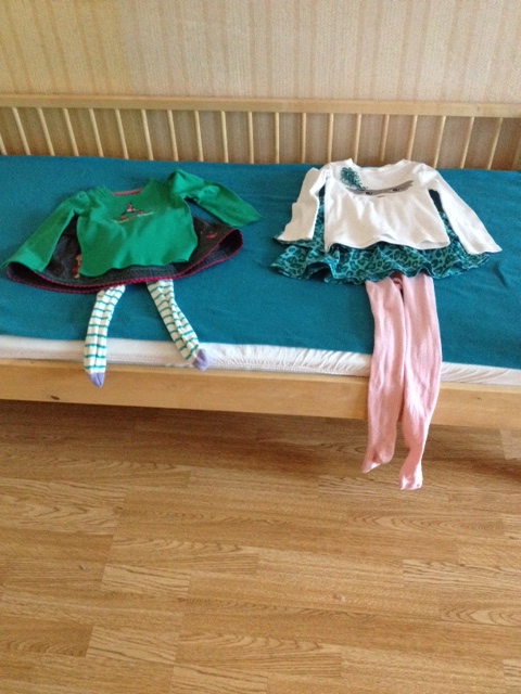 Дальше надо было сходить в магазин и погулять заодно. Опять две кучки с одеждой на кровати, одеваются.