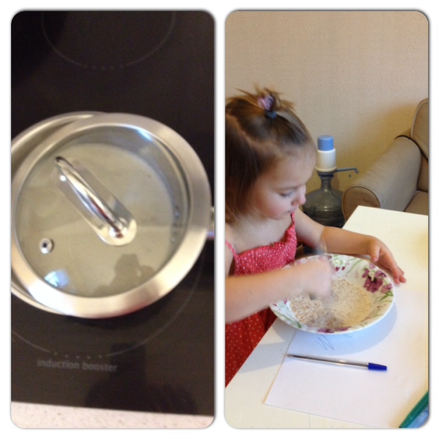Пока дети едят, я готовлю им одежду. Собираемся в кино. Также делаю себе завтрак. Очередная попытка правильно питаться и похудеть, у меня на завтрак овсянка с сухофруктами.