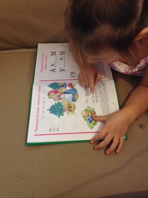 Вероника решила поучиться читать. Мы иногда занимаемся, но не сильно, так как логопед пока не разрешает.
