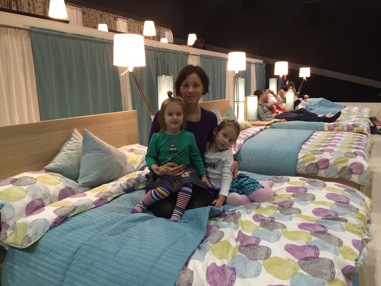 Так удачно получилось, что мультфильм показывали в зале с кроватями. ИКЕА поставила свои кровати в одном из залов кинотеатра. с 5 до 14 декабря длится эта акция. На входе выдали тапочки, в тумбочке лежало имбирное печенье.