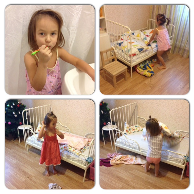 Дальше умываться, чистить зубки, заправлять кровати, причесываться, переодеваться. Кровати они заправлять не любят, но приходится.