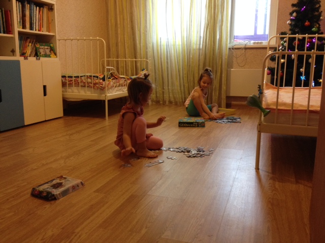 Дома детям дала пазлы, чтобы они увлеклись и не просили еду каждые две минуты. Пазлы лежат на верхних полках, сами они их достать не могут. Ставлю варить пельмени и себе рис.