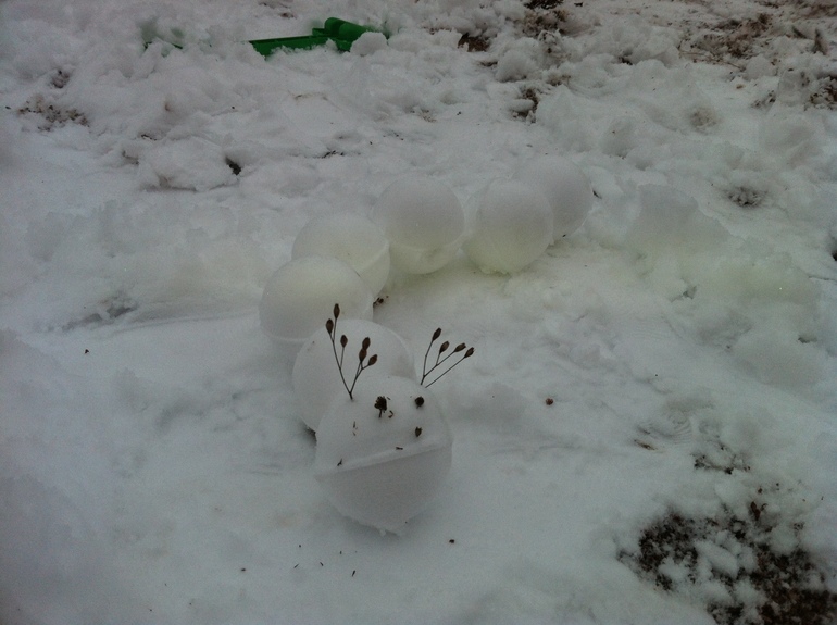 это первый снежок промышленного производства))))). Кстати чтобы они были плотными, надо раскрыть снежколеп, одну ложку погрузить в снег и провести в сторону чтобы собрать большую кучку снега, а потом погрузить вторую ложку снежколепа и закрыть. Получается вот такой красивый плотный снежок!