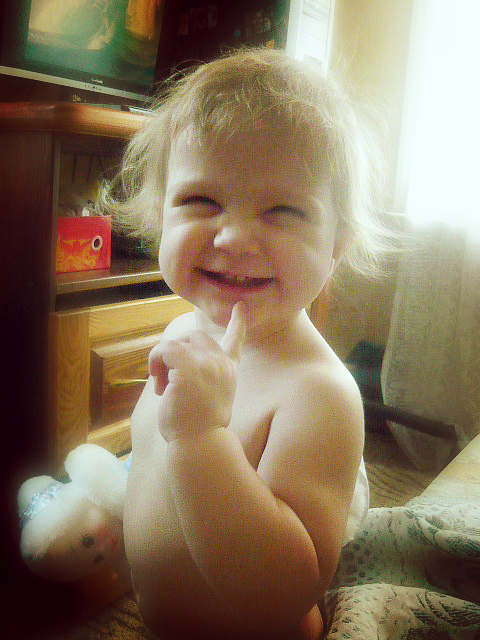 Особое чувство любви она питает КО МНЕ! Особое! Мне это очень льстит. Если Дашенька всё больше папиным "подарочком" (как он её называет) получилась, то Рада-моя РАДАсть и надеюсь нагРАДА за все мои нелёгкости! В последние дни она стала такой баловнюшкой. Схватит меня за щёку, встанет своими ножонками ко мне на колени и начинает прыгать, смеяться. Или сожмёт пальчиками мои губы как утёночку и поцеловала, единожды правда. Ещё помнёт нос мой, залезет пальчиками в глаза, пнёт в живот... Ну маленький бесенёнок просто) А что они делают на пару со старшенькой? (Слабонервным не читать!) Дашенька раскладывает её, растягивает её ручки по сторонам и давай её щекотать. А Раду мы подумываем вообще в борьбу отдать. (Смеюсь конечно, никогда!). В силу того, что родилась она под знаком близнецов-ей непременно нужна вторая половинка. Дашенька ею стала-отдувается так сказать. Когда Даша увлечена и долго не обращает на неё внимания-Рада начинает её бороть-просто наваливается сверху и падает) Весовая категория у них одна, но Рада всегда выходит победителем, потому что Дашенька более тонкая натура, вся такая "припевочка" как она есть.