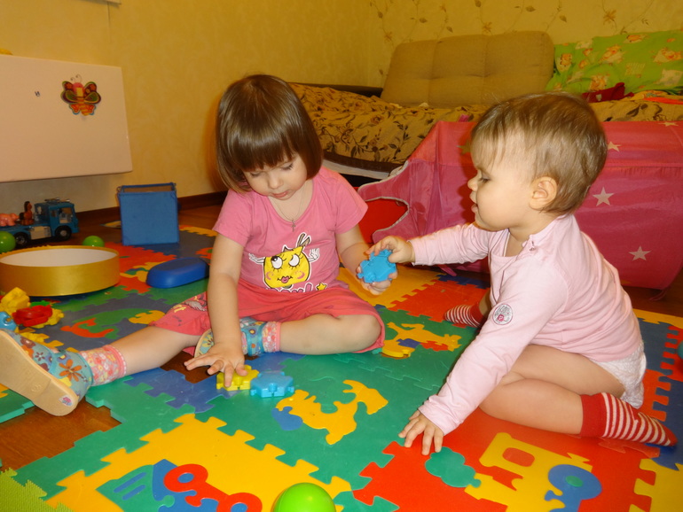 Настю я стразу приобщала к делам по уходу за младшей….принести подгузник…посыпать Аню присыпкой в нужном месте это Настя обожает делать…подать пеленку…показать игрушку….Вначале моей погодковой жизни ошибкой было то, что я старалась не проявлять больших чувств к младшей в присутствии старшей. Оказывается этого бояться не надо. Наоборот мы своими действиями показываем как надо относиться к младшему. Дети же нас во всём имитируют. Я исправилась ревности не было. Одной из проблем, по началу, стало купание. Насте не понравилось, что я шла купать Аню. Приходилось применять отвлекающие маневры во время данной процедуры, чтобы Настя, не дай Бог, не заметила, чем занята мама. Потом это прошло. Дневные прогулки, укладывание на дневной сон остались в прежнем режиме. В эти моменты Аня была с моим папой. Когда настал момент интереса Ани к игрушкам старшей дочки…Настя старалась не давать их ей…забирала….на что я её учила дать какую-то альтернативу…Настя давала при этом то, что уж совсем не жалко...либо ничего. Сейчас немного полегче в этом плане. А так, если обобщить совместные игры…то они могут играть в одном месте…только надо каждой что-то дать такое, что их увлекает…в данный момент, либо придумать игру, которая нравится обеим.