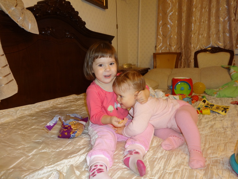 Многое естественно под моим контролем. Стараюсь не противоречить тому, что обещала ей будучи беременной. Я обещала ей лучшего друга….а отношения с лучшим другом запрещать нельзя! Аня тоже тянется к Насте…смотрит, что делает сестра, старается участвовать в этом…что-то говорит ей на своем младенческом языке….и Настя ей, кстати, отвечает жаль что я не понимаю о чём они! Иногда Аня обижается на Настю…когда та ей что-то не дает или стукнет…пытается даже дать сдачи а что хочешь жить - умей вертеться! Я смотрю на них и радуюсь, что они у меня есть…обе…такие разные, милые и самые родные. Наступит момент, когда они станут друг другу ближе…будут лучше понимать другу друга ….будут делиться своими секретами которые к сожалению я не буду вероятно знать….но мне уже легче, что они есть друг у друга…