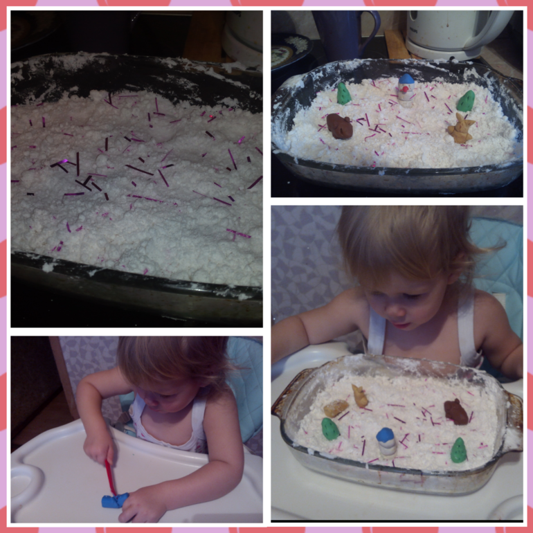Сделала Сашке снег))) стали с ней лепить из пластилина фигурки-елки, снеговик, заяц, медведь)))) Вот что получилось)))