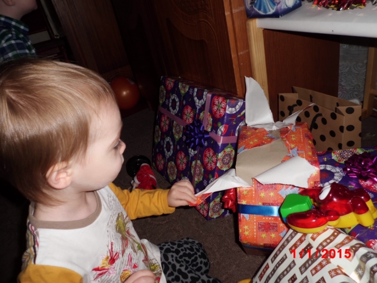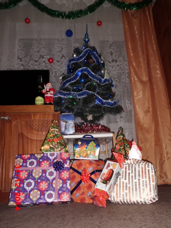 Столько подарков! Жалко не показали что там внутри =))) МЫ тоже по семейному сидели, дети салют посмотрели правда, и легли в час ночи =)