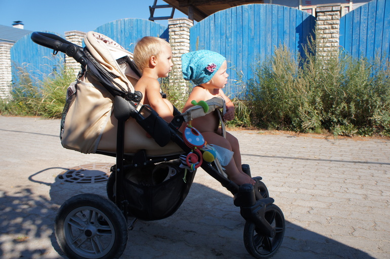 Опять же перелопатив интернет, я остановилась на Peg-Perego для двойни. почему не Фил, потому что нижний в корзине))) знакомая причина?)) почему не сдвоееная, потому что Елисей обязательно будил бы Ясю на прогулки, у него миссия такая была - разбуди сестру - получи нагоняй)) Перегой я осталась довольна, она, конечно, тяжёлая громила, но манёвренная, и сиденья устанавливаются, как душе угодно. когда кто-то из них спал я ставила их друг за другом, когда бодрствовали - поворачивала лицом друг к другу, и они развлекались.