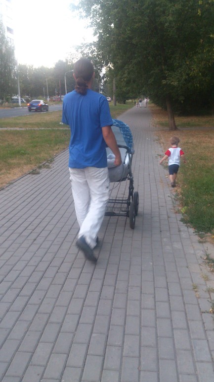 Гуляние. Старшего давно начали отучать от коляски. С лета мы активно ходим без нее гулять. Я не стала покупать коляску для двоих. Считаю, что это баловство :) Алиса гуляет в бывшей Даниной люльке, Данина трость пылится в шкафу (маленькие колесики не проедут по снегу). А мы гуляем сейчас или пешком, или на санках. Если на санках то зависит от настроения: плохое - едет, хорошее - идет или катит сам. Если идем пешком, а он устает, а гуляем мы на большие расстояния всегда, не рядом с домом, тогда я просто сажаю его на край коляски лицом к себе. Он сидит больше на чехле и не слишком давит на Алискины ноги. Хотя иногда она его и пинает. Но это крайний вариант, если уже лег на землю и никуда не идет. А вообще стараюсь в ним договориться, что осталось дойти чуть-чуть.
