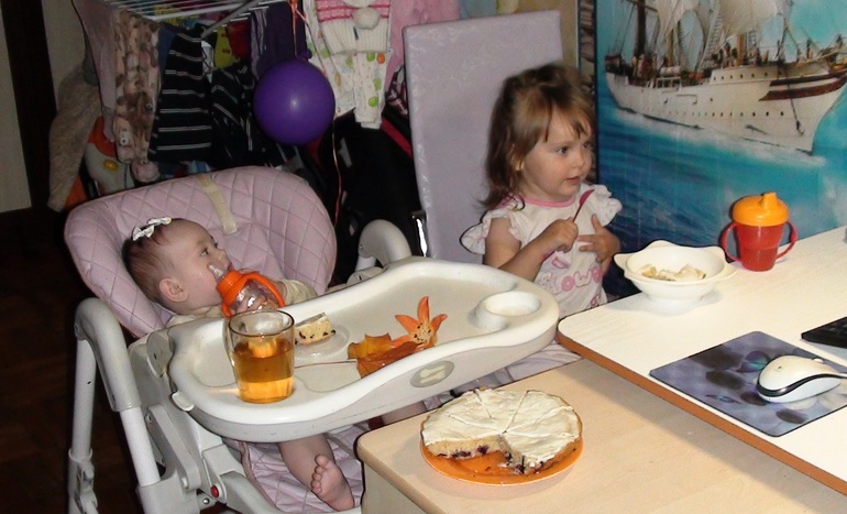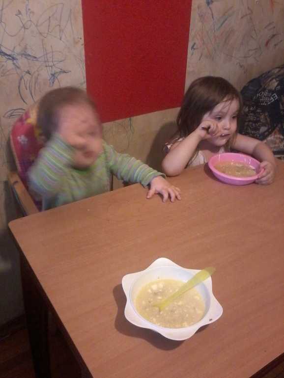 вот время уже 15:30... мы обедать садимся. Надя уже спит в супе и капризничает. Да и Соня, казалось бы..