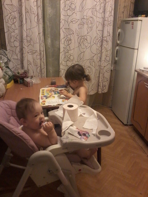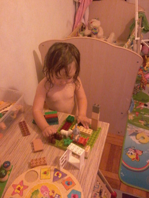 в 19:30 ужинаем картошечкой с мясом ( не фоткала, кормила Надю). а потом снова лечение и игры. уже всякие. и со мной и без меня. белье постриалось, развешиваю, посуда опять же.. ну в вообще я сама люблю с ними ползать и хохотать))) с их домик залезть, рисовать с Сонькой.