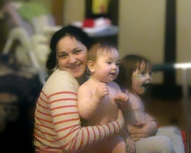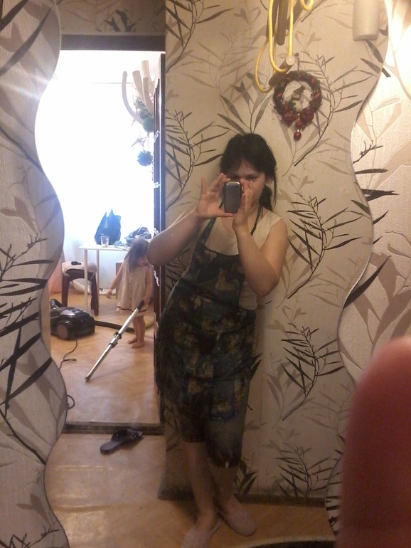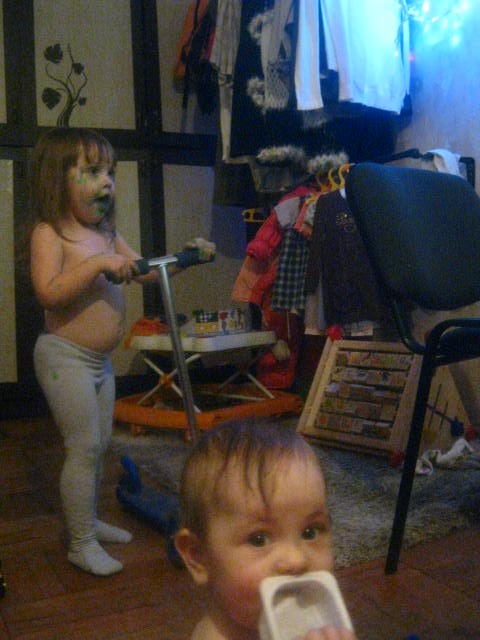 Соня чаем кофту замочила- сняла. ее раздражает мокрое)) зато не раздражает моя зеленая гуашь на моське, которой она измазалась, пока я мыла попу Надику.