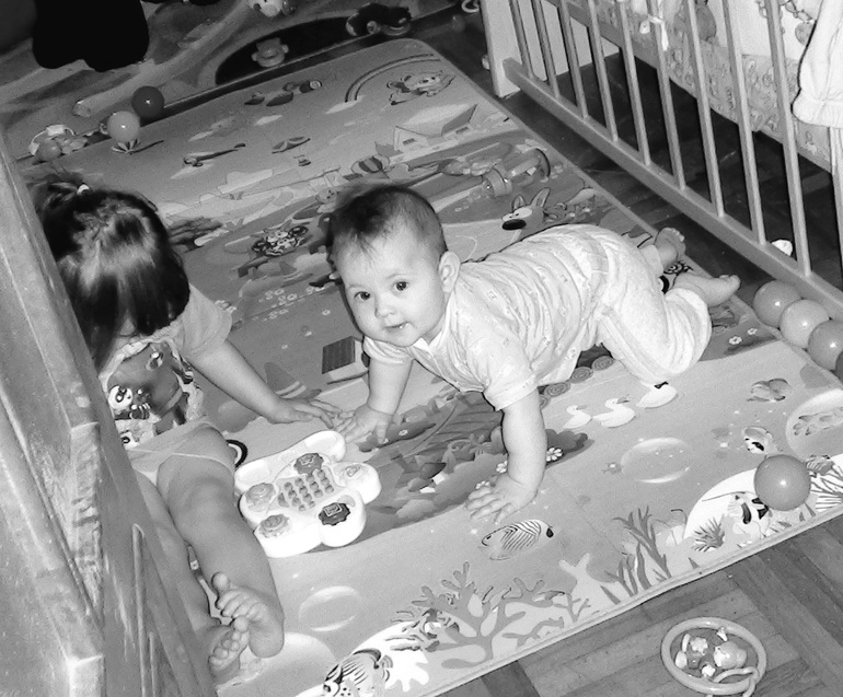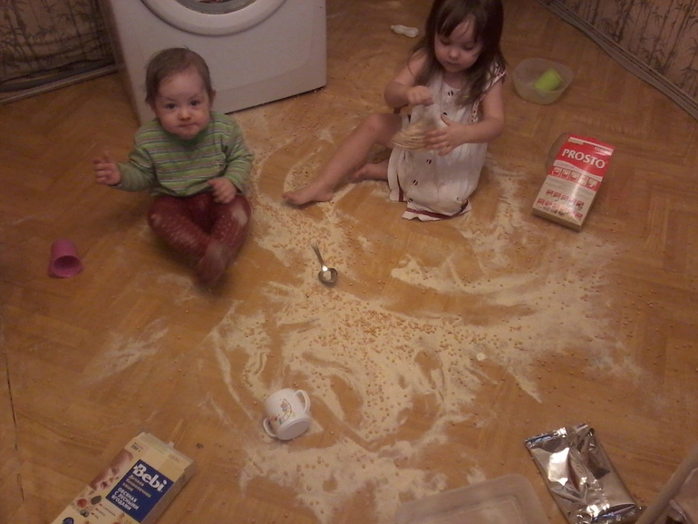 Они много играют вместе. Особенно здоровская игра - "доползалки" . Наденька у нас пока только стоит у опоры и передвигается от одной опоры к другой. Соня решила на ее "языке" играть. уползают по всей квартире, догоняют друг друга. не могу сфотографировать, уж слишком быстро они перемещаются -телефон не осилит). в общем играем мы вместе, пока варится суп, но только после: