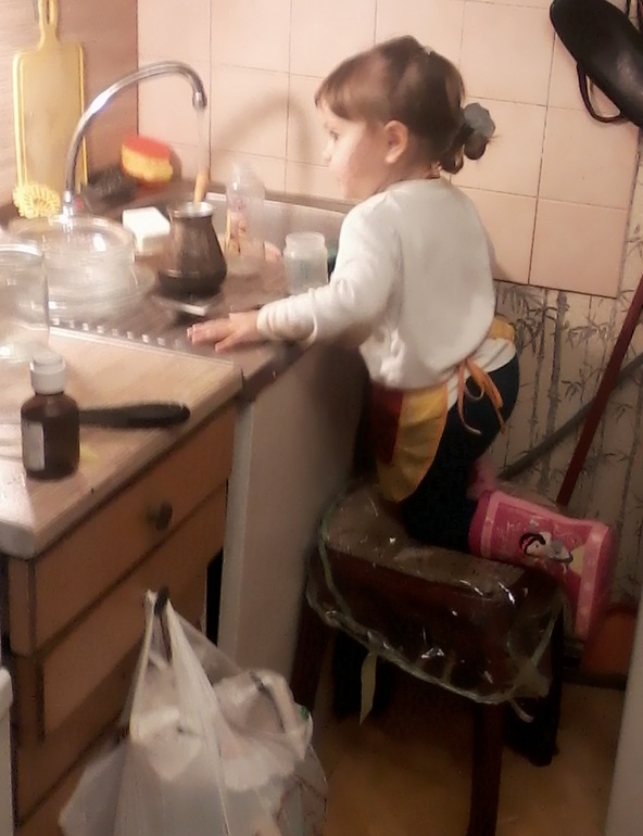 Соня моет посуду в резиновых сапогах, чтобы не промокнуть :)))