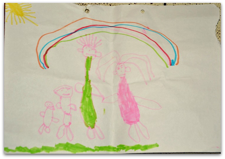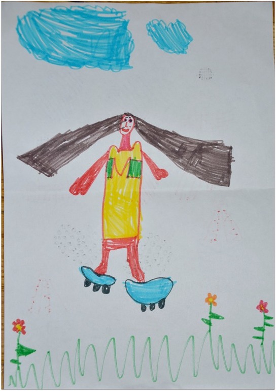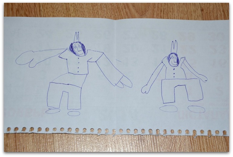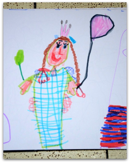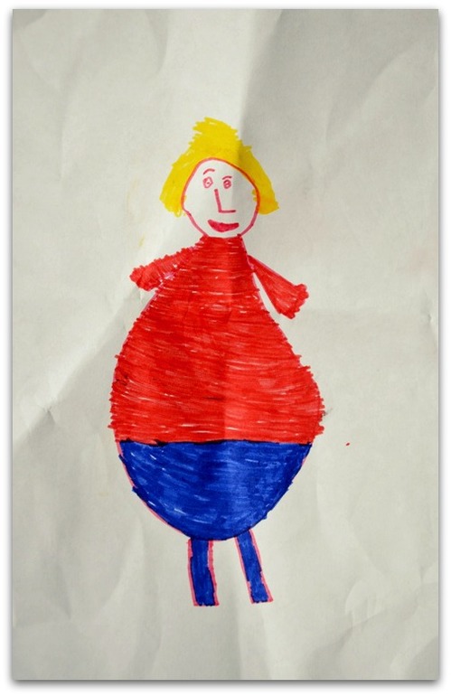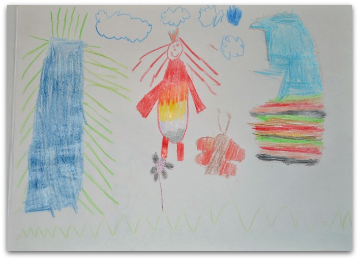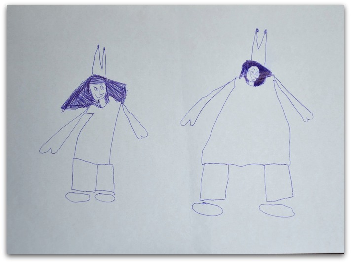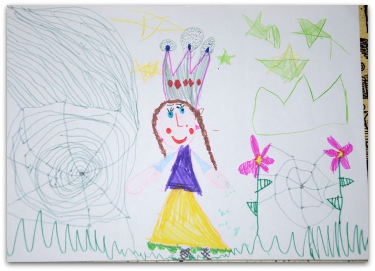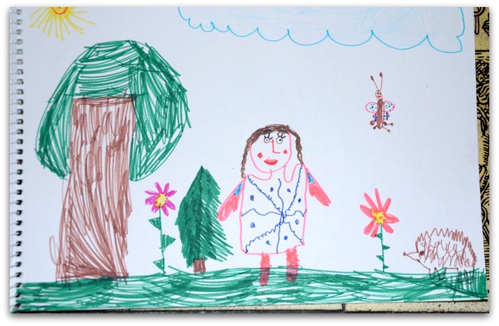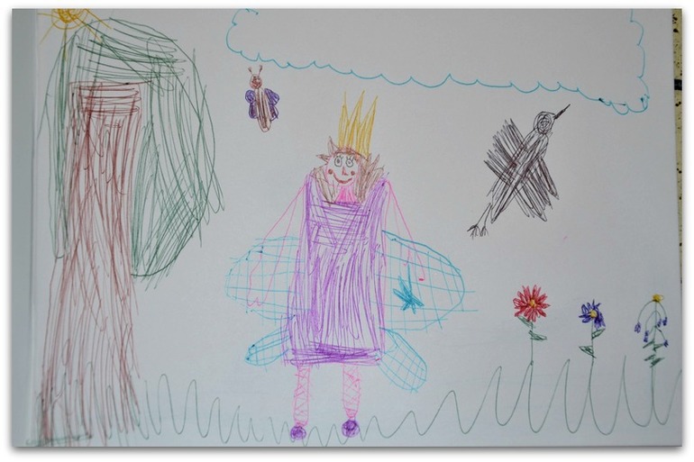 Особенно радует то, что дети развиваются. Тонконогий человек с черточками-пальчиками превращается в мясистого солидного человечище, а потом в улыбающуюся от уха до уха девочку, а затем в принцессу с короной на голове и косами до полу, а потом и вообще в чудесную фею в пуантах и стрекозиными крыльями.