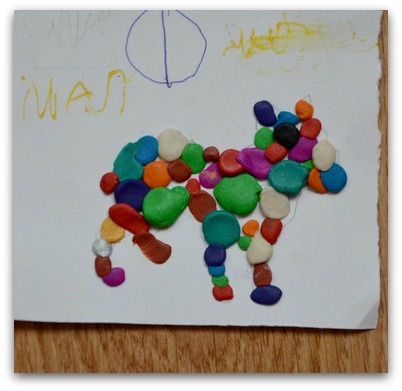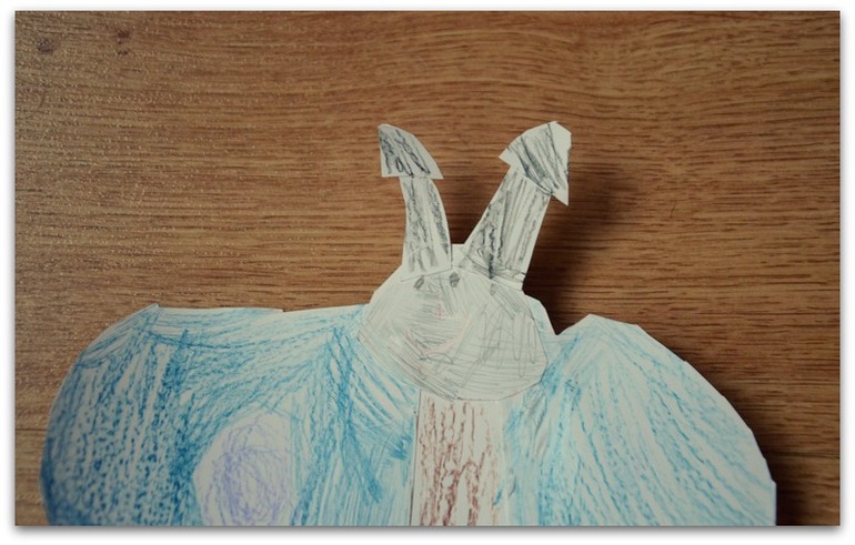 Вот это любино произведение я особенно люблю. Знакомьтесь - это заяц. Ну вот такие зайцы водятся у нас в саду. ))) Всем раздали трафареты и сказали обвести зайца, чтобы размазать по нему пластилин. Люба и зайца такого необычного выбрала, и скреативила с пластилином.