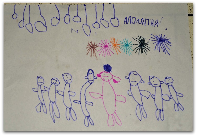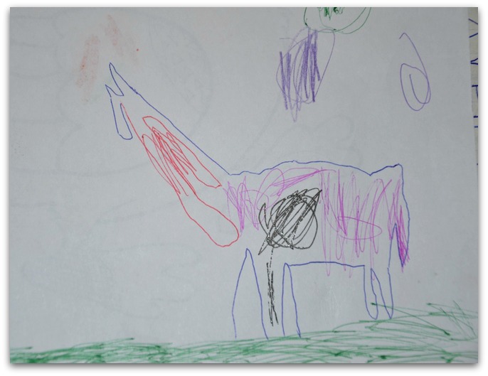 Недавно дети увлеклась рисованием цветными ручками. Вот симина пони с рогом, например. Она считает, что пони не получилась. Получился какой-то жираф. А я считаю, что очень даже себе приличная лошадь. Для меня более важно, что Серафима рисует по контуру, а не отдельно ножки-ручки-голова.