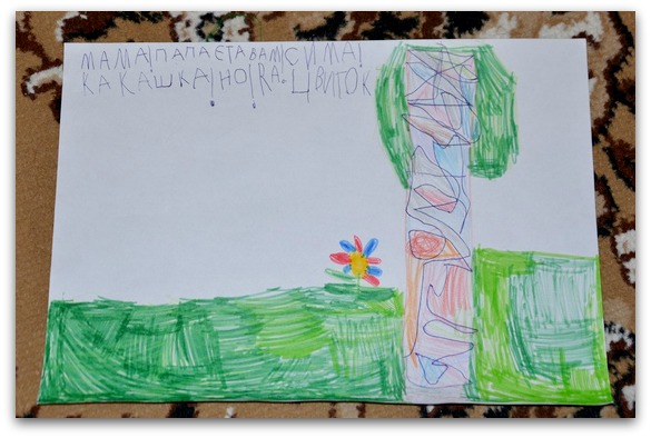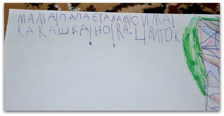 Если кто не понял, перевожу: "Мама и папа, ето вам. Сима - какашка. Но я - цвиток".