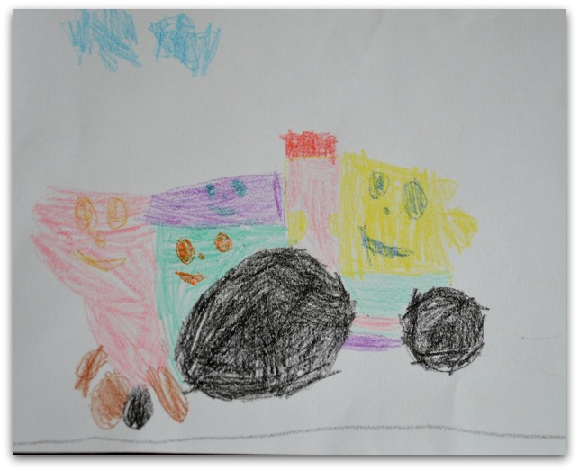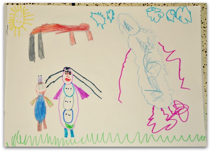 Еще у Любы часто целая история на рисунке. Вот, например, триллер: красавицаы, чудовище и батут... Причем, чудовище всегда такое абстрактное и размытое. Причем здесь батут, дочь не объяснила. Ну да ладно, у мастера свои заморочки. ))))