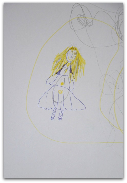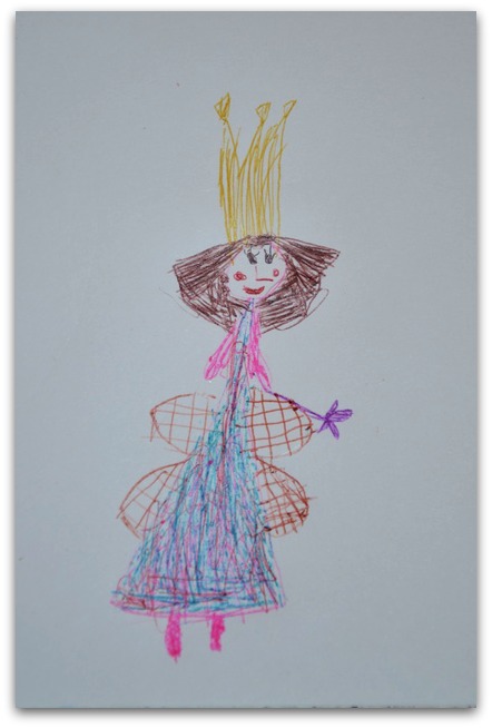 Ээээ, по бокам платья принцессы рюшечки... Я учила их рисовать по низу подола и на лифе, но у Любы свой художественный вкус. ))))