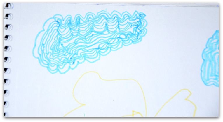 Тщательно зарисовывает траву, небо, не пугается кропотливой работы. Недавно стала рисовать такие вот каракулевые облака. То ли сэкономить время (чтобы все сплошняком не закрашивать), то ли наоборот процесс нравится. )))