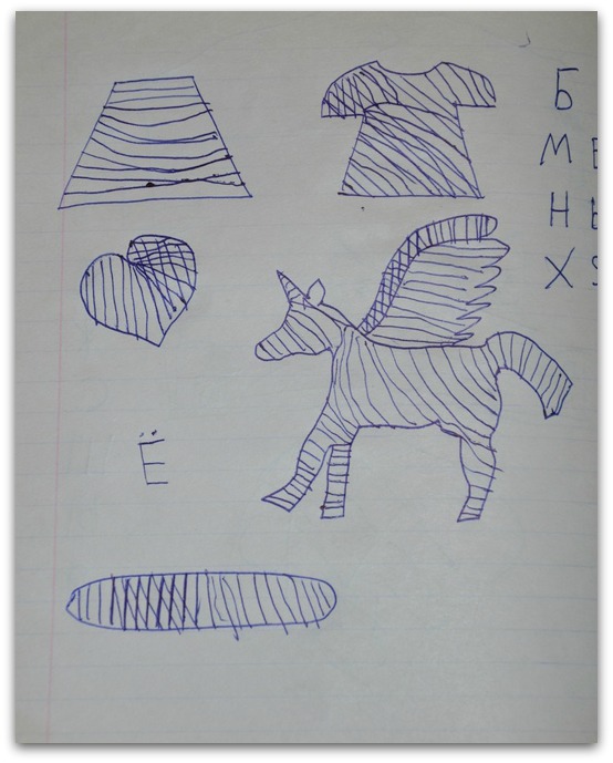 А недавно увлеклась штриховкой. Просит нарисовать ей рыбку, птичку, обезьянку, лошадку с рогом и крыльями, сосиску, банан… И штрихует в разных направлениях. Набивает руку. Любе штриховка давалась сложнее, она покорилась ей не сразу. Теперь в субботний вечер я пеку блины, а дети штрихуют. ))))