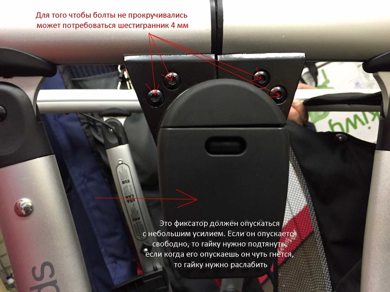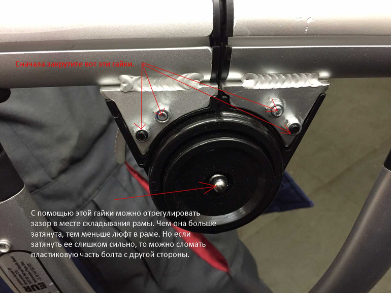 Люфт можно устранить, если подкрутить 5 гаек с каждой стороны рамы (сначала 4 маленьких, а потом одну большую - центральную). При регулировке центральной (большой) гайки обратите внимание на то, чтобы боковые пластиковые фиксаторы (крылышки) закрывались с небольшим усилием - если они закрываются свободно, то люфт останется, а если с большим усилием, то их можно сломать. Также, для того чтобы гайки самостоятельно не раскручивались, то перед их закруткой на их внутреннюю поверхность мы рекомендуем нанести синий фиксатор резьбы (небольшой флакончик - он похож на тюбик суперклея - можно приобрести в любом автомагазине).