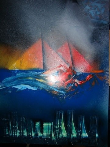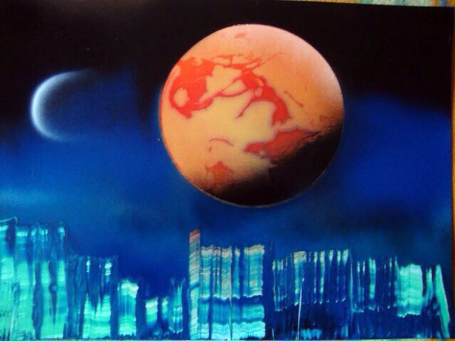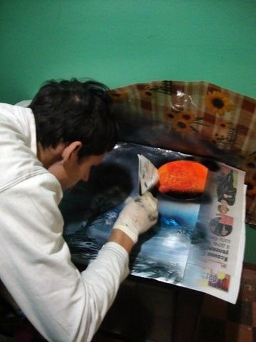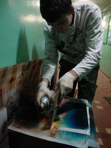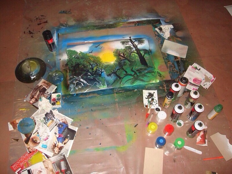 Технику освоил сам , ( набор такого художника - это баллончики , скребки , крышки разного диаметра , газеты, фотобумага , )