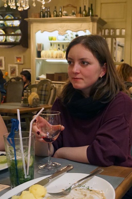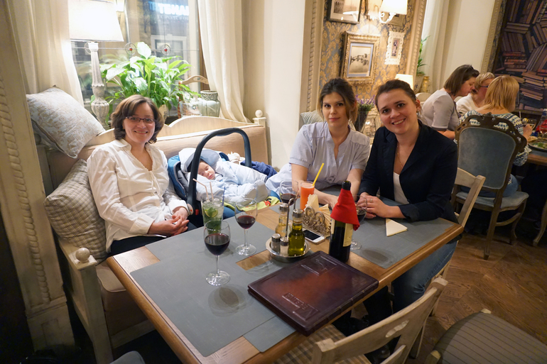 Встречались мы в траттории "Венеция". Попросила девочек выйти встретить меня, а то с переноской в кафе как-то неловко что ли)). В гардеробе работники встретили нас весело, ничего такого про малыша не сказали, все норм).