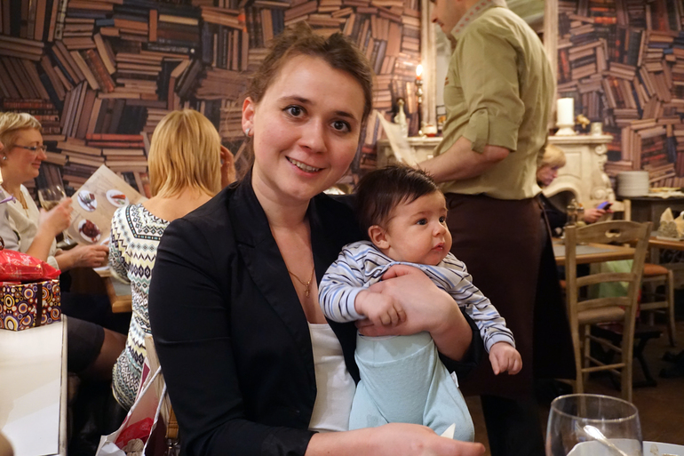 Я переживала, что Вовастик разгуляется в кафе, ведь он весь день спал, потом еще и в машине всю дорогу, поэтому и взяла слинг то (он в нем гарантированно засыпает, за редким исключением). Но нет, Вова почти всю встречу проспал - часа полтора и минут 40 тусил (ел и позировал :)))