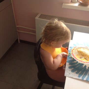 Женя ест аккуратно, а Маня не стесняясь выгребает остатки из слюнявчика:)