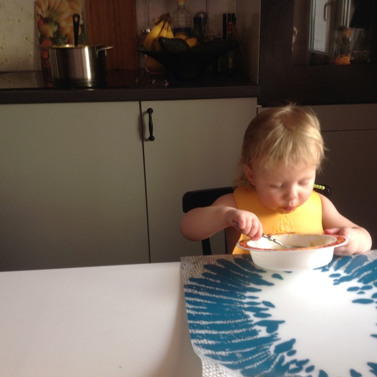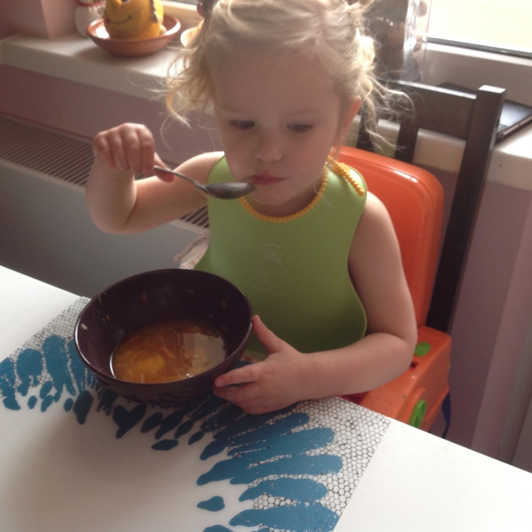 Один наш день12-30. Приезжаем домой. Дедушка быстро обедает и убегает на работу. Мы тоже кушаем. Тыквенный суп-пюре с курицей - самый любимый суп, готовится в разы чаще всех других супов.