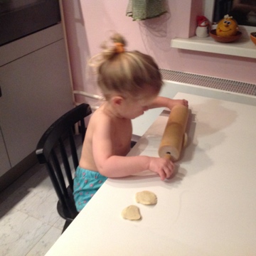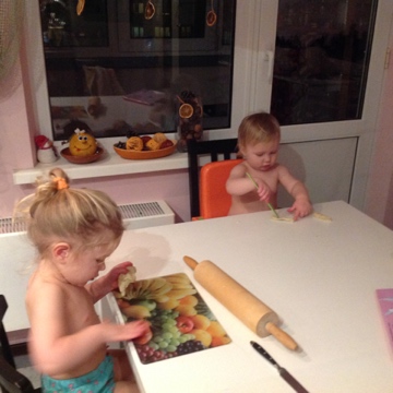 Пока я вожусь девочки играют тем, что ближе всего, на кухне это тесто.