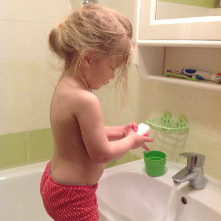 Около 19-00. Моем руки. Девочки-чистюли, а счета за воду огромные.