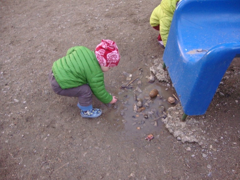 Нашли прекрасную лужу, благодаря ей я впервые посидела на лавочке 20 мин. Обычно Маня тянет меня за собой.
