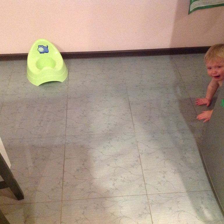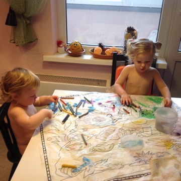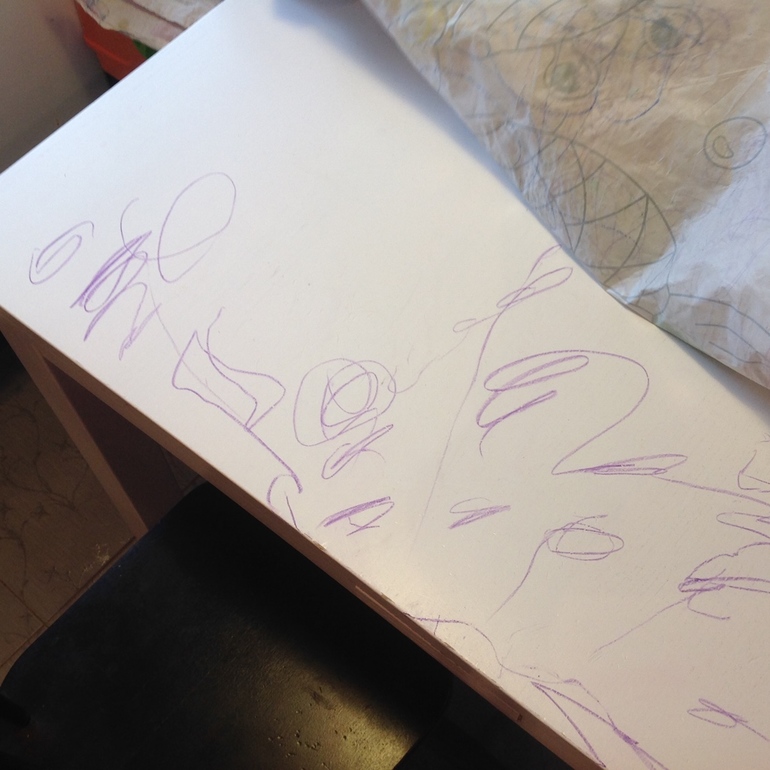 Пока я отвернулась Маня подняла скатерть и нарисовала на столе. Затем она безропотно отстояла свою минуту в углу, пока я устраняла последствия.
