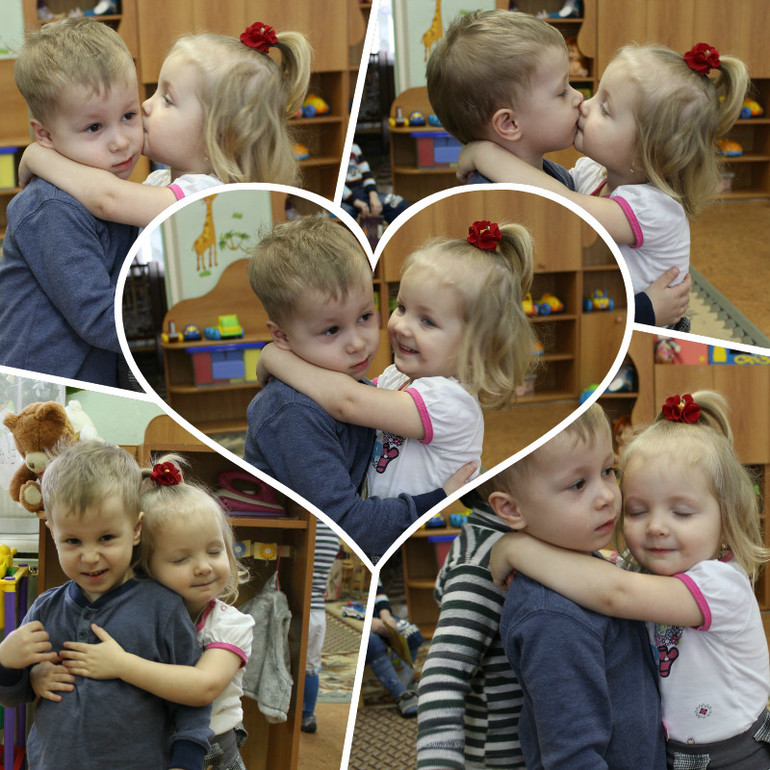 А сегодня я пришла за Настей в сад, а воспитательница говорит:"Настя тут к мальчику Артему пристает!" (и улыбается). Я подумала, бьет что ли? А она:"Она его обнимает и целует постоянно, почти не отходит от него)) Он сначала сопротивлялся, а теперь, кажется, привык, я вам вечером фотографии скину!") Мы посмеялись. Она сказала еще, что остальные девочки сказали, что тоже хотят так, и тоже начали обниматься и целоваться. Дома я посмотрела фотки, они такие милые))) Правда Артем не особо рад, зато Настя прямо кайф ловит!))) Фоток много, сделала коллаж: