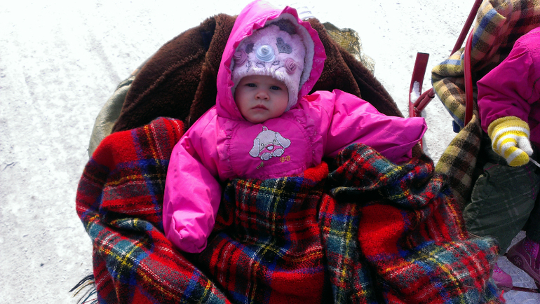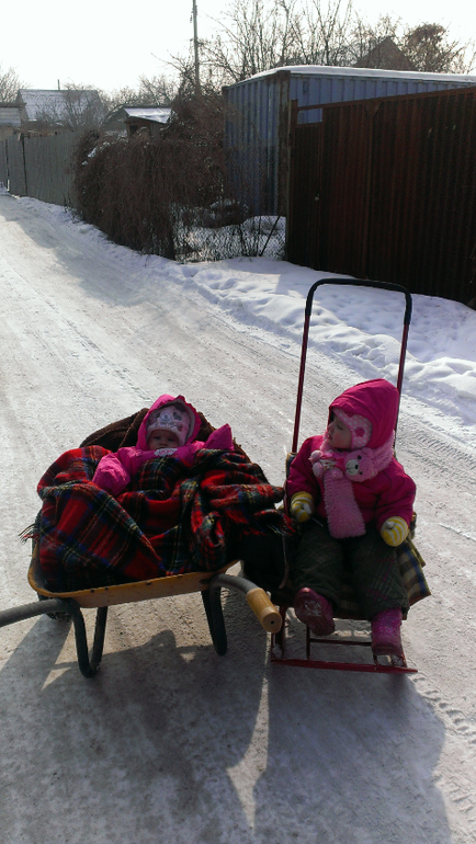 На прогулке. Были на даче у свекрови (просто почему-то их загородный дом называем по старинке дача). Коляску забыли из машины выложить, поэтому Аришка каталась в тачке)) Зато вездеход, да и маме какая физ. нагрузка!