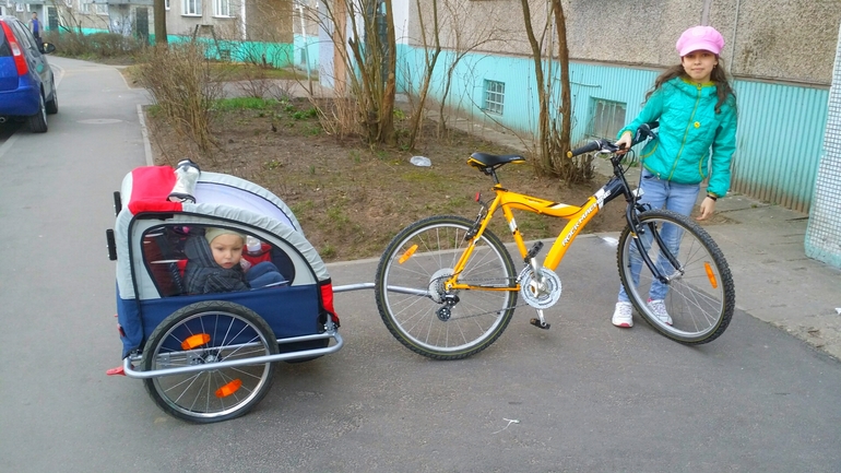 Я с рук брала, увидела и сразу поехала покупать. На него накинулись сразу))) девушке он не нужен. Почти новый был. За 100€ отдала. У него еще третье колесо есть ручка с тормозом. Его еще можно как коляску использовать. А новые есть в веломагазинах. Сама видела. Я сама Он ем с прошлого лета мечтала. Щас дико довольна.