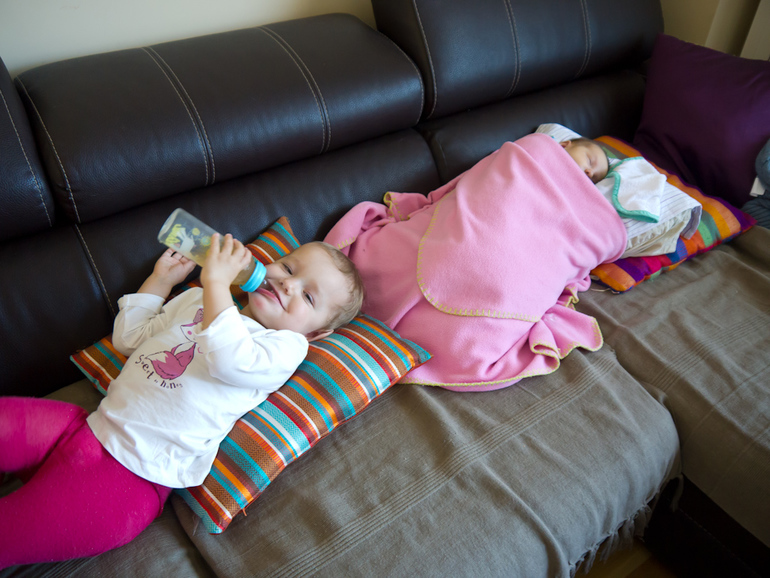 Могу сказать, что с каждым днем наше существование вчетвером становится все более спокойным и счастливым)) Ревность старшей понемногу стала ослабевать, и хотя она по-прежнему недолюбливает младшую и практически ей не интересуется, истерик с ее стороны стало меньше, и это не может не радовать! А еще она стала говорить Лида, когда маленькая плачет и пару раз предлагала ей попить из своей бутылки. В общем какой-никакой прогресс))) Младшенькая растет не по дням, а по часам, очень контактная, спокойная и улыбчивая девчушка)) Мы с мужем распределили обязанности (как по дому, так и по уходу за детьми) и стараемся следовать режиму. Вечером, как правило, выходим всем семейством на прогулку. Вот как-то так и живем))